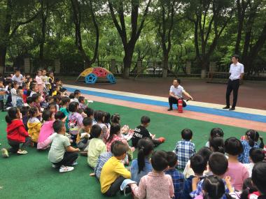 上午9:40左右,园内忽然听到紧急的警报声,各班教师迅速按紧急预案的疏散线路带领幼儿拿起湿毛巾,捂住口鼻,猫着身子,分两道楼梯迅速且有序下楼来到操场。很快孩子们集中到操场安全地带。演习结束后,赣安公益培训中心的万警官为孩子、老师们演示用灭火器灭火的过程,也邀请了孩子、老师们进行体验。