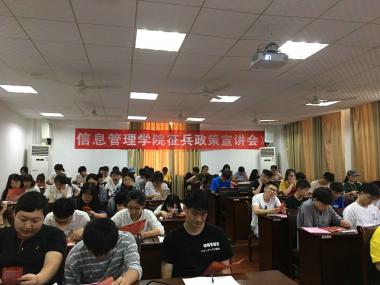 为增强师生国防观念,激发师生爱国热情,鼓励更多的大学生参军报国,信息管理学院开展大学生征兵工作,下午在荟庐召开征兵宣传动员报告会。各班班长支书等80余人参加此次报告会。信息管理学院党委书记邹春发,党委副书记杨婉琪出席会议。
