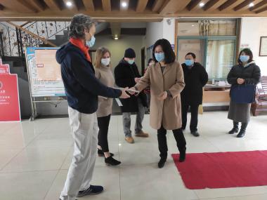 赵慧亲切慰问我校留校外籍教师,详细了解国际合作与交流处疫情防控各项措施,询问外籍教师疫情期间在校生活的情况。赵慧对我校外专公寓在疫情防控期间实施封闭管理工作表示肯定。她强调,目前疫情防控出现了积极变化,但形势依然严峻复杂,要时刻紧绷加强疫情防控这根弦。随后,赵慧代表江西省外办将15个口罩赠予我校外籍教师。