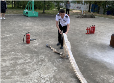 实践操作环节现场演示了灭火器的使用,以及消防水带的正确使用方式,并分组进行实践操作,真实体验消防器材的使用和操作程序。樊文浩科长亲自演练了灭火器的使用方法;在认真听讲及观摩后,学生们亲自体验了现场灭火的过程,面对熊熊燃烧的火堆,学生们表现得十分沉着,熟练地按照灭火的步骤和方法,将石油燃起的火成功的迅速扑灭。