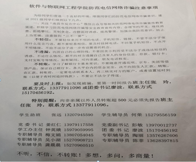 姜红仁强调,每位同学都要增强安全防范意识,切实维护自身利益。不要在网络上进行贷款、刷单、赌博等行为,不要向对方透露自己及家人的身份信息、存款、银行卡等情况。理性消费、拒绝攀比,克制贪念,冷静面对诱惑,时刻以“三不一要”标准警示自身。不轻信、不透漏、不转账,如发现被骗,要第一时间上报,尤其是向非亲属以外人员转账超500元必须先报告班主任。