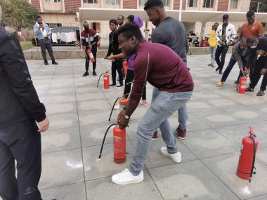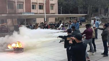 消防逃生演练结束后,为进一步巩固实践效果,市消防支队袁教官还现场演示了灭火器使用的“四”大步骤——提拉握压,并让大家亲身体会使用灭火器,使参训人员都能正确掌握干粉灭火器的操作方法。