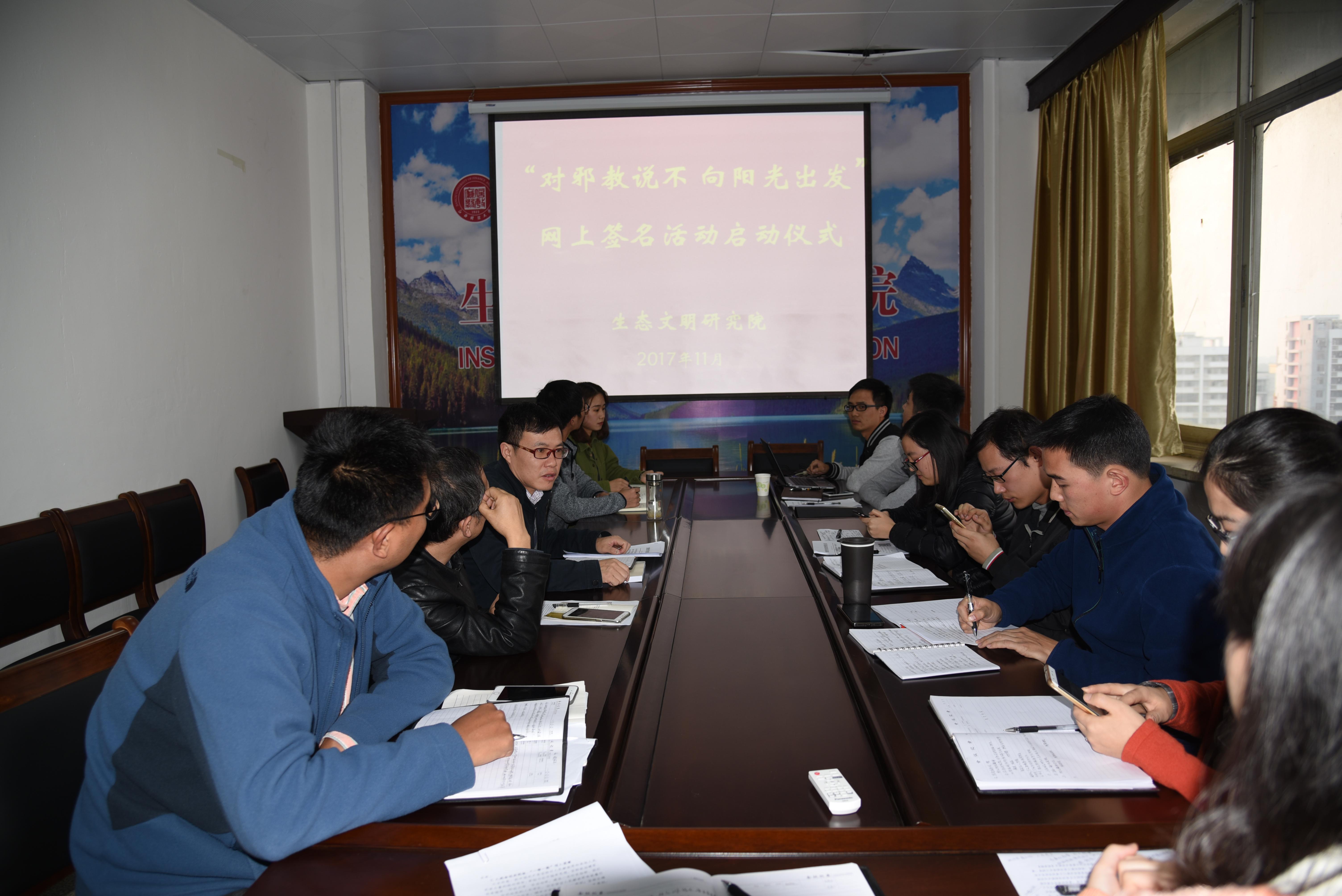 生态文明研究院于2017年11月8日下午在院会议室启动了“对邪教说不 向阳光出发”网上签名活动。按学校文件综治字(2017)14号文件:《关于组织开展“对邪教说不 向阳光出发”活动》的通知,我院领导高度重视,组织了全院师生,开展了“对邪教说不 向阳光出发”活动,在会上,谢花林院长传达了学校的文件精神,宣讲了反邪教的相关知识、案例,宣布启动 “对邪教说不 向阳光出发”网上签名活动,并依次将网上签名活动流程给大家传看。最后鼓励大家积极参加“反邪教知识竞赛”。
