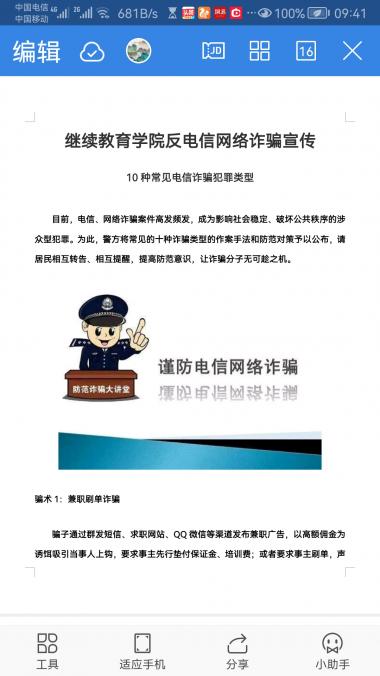 活动中,学院制作了一些主题图片,还有“继续教育学院反电信网络诈骗宣传”文稿彩图发到院微信群,供大家学习。还组织了国家反诈中心APP的下载,提高了下载注册率。