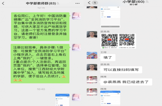 2022年3月中旬以来,根据南昌市疫情防控的统一要求,江西财经大学附属中学的全体教师进行居家办公、云端授课。在这种模式下,为进一步加强学校安全工作,增强学校教师消防安全意识,提高自救防范能力,4月22日上午,为响应经开消防大队的积极号召,附中进行了线上消防学习的宣传,组织老师们积极注册并登录“全民消防学习平台”。