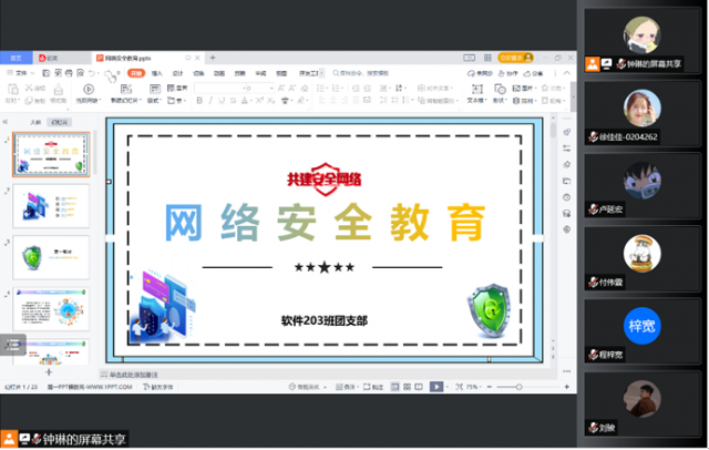 软件203班开展以“网络安全教育”为主题的团课,通过案例展示、知识宣讲、竞赛答题、汇报演讲等丰富多彩形式,向同学们传播健康上网、依法用网、文明护网的安全意识,增强同学们网络安全防范意识和自我保护技能。软件206班通过开展“网络安全教育”主题班会,通过视频、具体案例、所见所闻等敲响同学们网络安全的警钟。学院19至21级各班都开展不同形式的网络安全教育主题活动,通过充分调动学生的积极性、主动性和创造性,使网络安全教育入耳、入脑、入心。