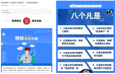 在新生到校前,软件学院就利用新媒体渠道,通过学院官方公众号,实时进行微信推送。推送内容主要包括诈骗形式、预防电信诈骗“八个凡是、六个一律、三不一要”和预防诈骗的相关建议。同时动员大一新生下载国家反诈中心APP,并打开“来电预警”、“短信预警”等功能。在学院设计的迎新手册中,还特意增加防范电信网络诈骗专栏,通过多方位的宣传使反诈教育入耳、入脑、入心。