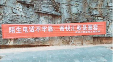 此外,软件学院制作电信网络反诈的宣传横幅,悬挂于各栋宿舍楼门口等较为醒目的地方,往来之间加深同学们对反诈知识的印象,时刻提醒同学们切忌误入诈骗陷阱,绷紧防范电诈之弦。