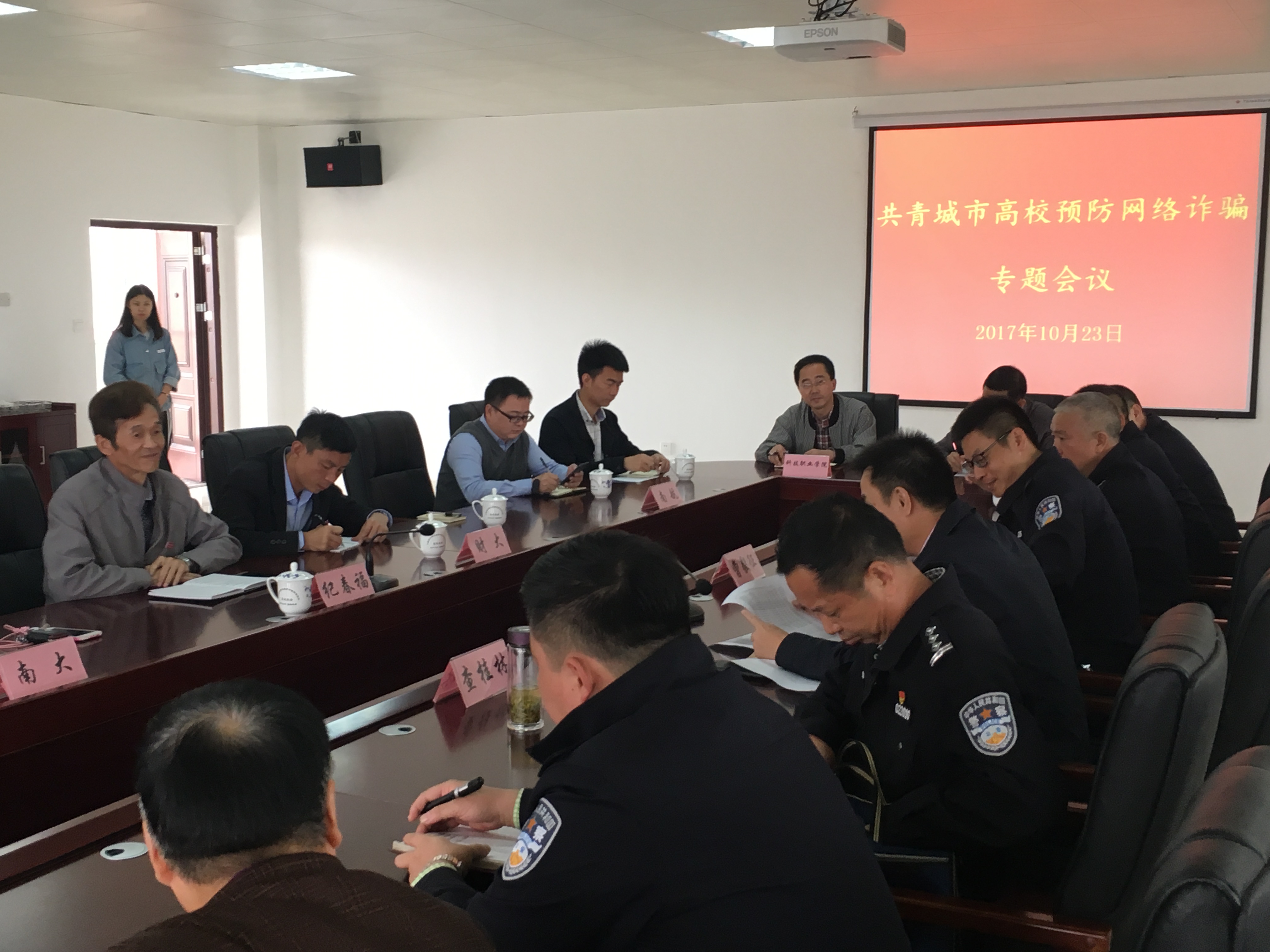 10月23日上午9时半,共青城市高校预防网络诈骗专题会议在我院行政楼第二会议室顺利召开。共青城市分管治安、交通、刑侦等工作的有关市领导、相关部门负责人出席了会议。市内各高校保卫部门负责人到会参加并建言献策。会议由张明市长主持。