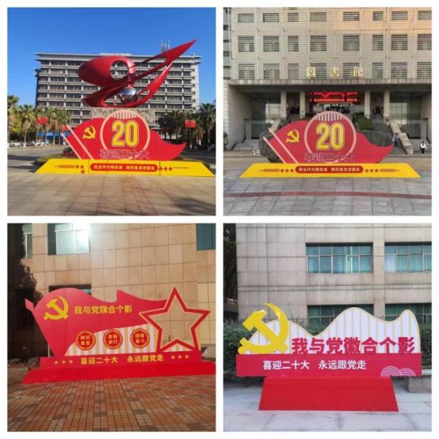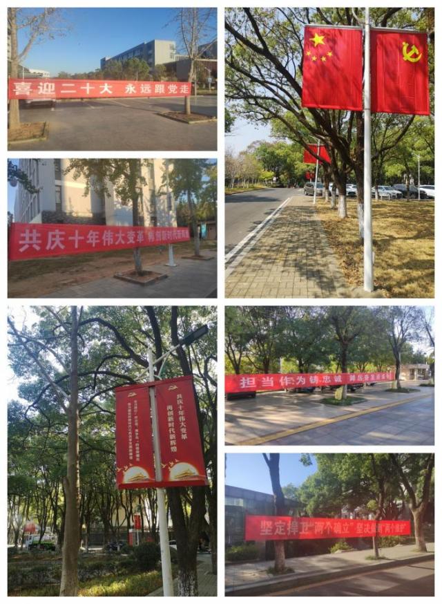 从立体标识的设计到宣传标语的选择,从绿植摆放的位置到横幅张贴的长度,“喜迎二十大”环境布置工作精心规划,历时近两个月。随着盛会临近,江财校园越来越红,越来越美。走进校门,映入眼帘的是“喜迎二十大”及“我与党旗合个影”“我与党徽合个影”的立体标识;校园主干道上一排排鲜艳的五星红旗和党旗随风轻展;灯柱上“喜迎二十大 永远跟党走”的道旗分外醒目;地下通道的橱窗里, 一幅幅红绸金光为背景的标语喷绘整齐排列;“担当作为铸忠诚,踔厉奋发迎盛会”“牢记嘱托作示范,感恩奋进勇争先”“奋进新征程、建功新时代,以优异成绩迎接党的二十大胜利召开”一条条横幅标语振奋人心……