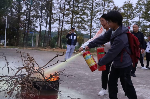 樊科长还带领同学们来到操场上开展灭火器使用的现场教学。樊科长细致讲解灭火器的原理、种类,并亲自演示,强调技术要领。在使用干粉灭火器前一定要充分摇匀,并仔细检查气压表是否指向绿色标识方向。使用时要将灭火器上红色和银色扣拔掉,一手提灭火器,一手握软管上的喷嘴,对准火焰的根部进行扑灭。同学看仔细聆听,耐心观看。在实践操作过程中,面对熊熊燃烧的大火,同学们也表现的十分沉着冷静,按照学习到的技术要点,正确使用灭火器,成功将大火扑灭!