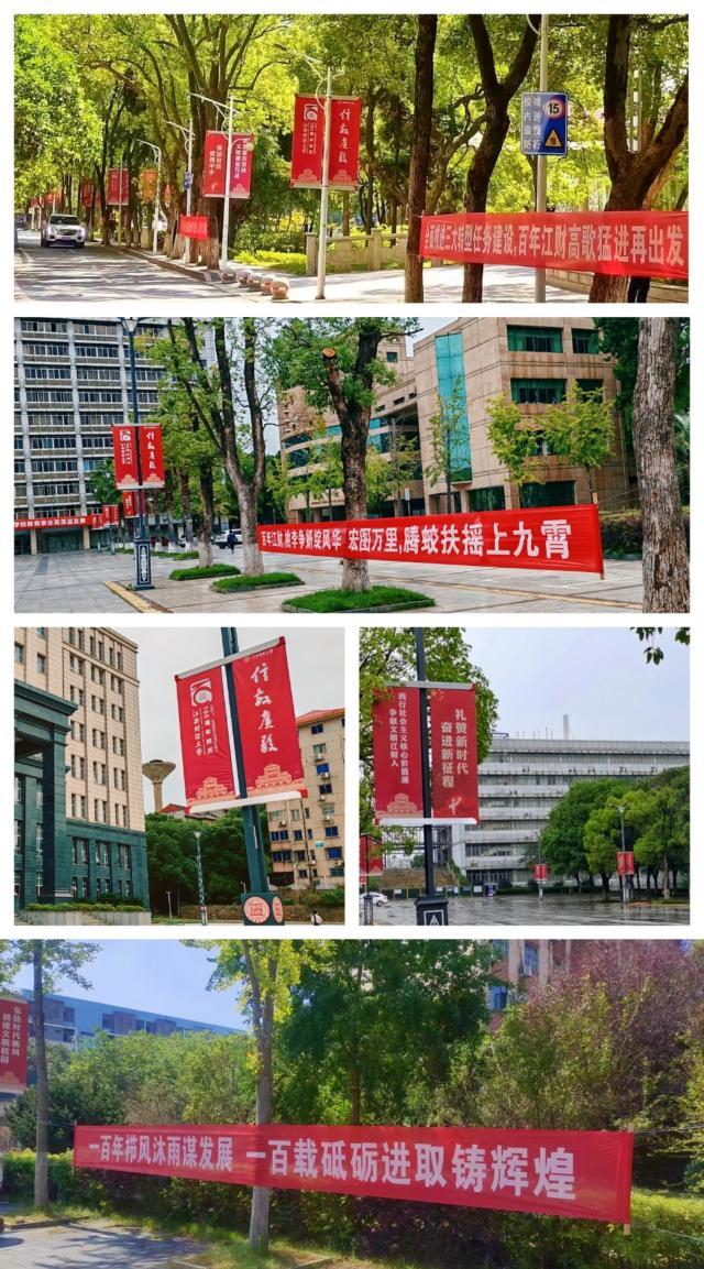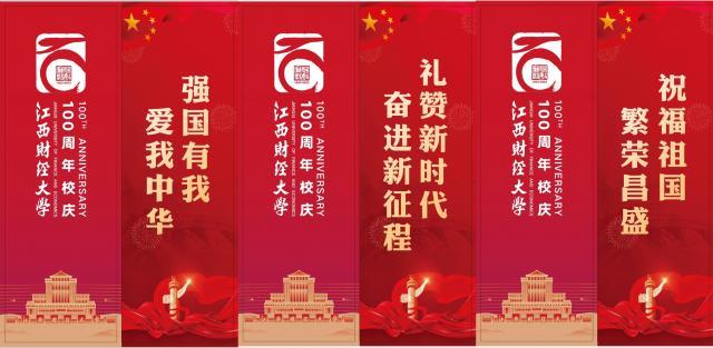 今年是中华人民共和国成立74周年,也是我校建校一百周年。为迎接国庆、校庆,营造节日气氛,党委宣传部、文明校园促进中心精心打造“红十月”,把中国红、江财红融入环境布置,以道旗、横幅等形式,给校园添色增彩,为祖国庆生、为江财庆生。道旗以红色为主色调,采用双面设计,一面为国庆标语,一面为百年校庆标识,在各校区主广场、图文信息楼、大礼堂等处的主干道灯杆上整齐排列,与成荫的绿树互相掩映,耀眼非常。布置在崛起广场等处的横幅则是校园里的情怀担当——“百年江财,桃李争妍绽风华宏图万里,腾蛟扶摇上九霄”“全面推进三大转型任务建设,百年江财高歌猛进再出发”……一条条标语既是即将到来的校庆预告,也展现了我校的办学成果、精神传承,获得师生共鸣,吸引师生驻足。