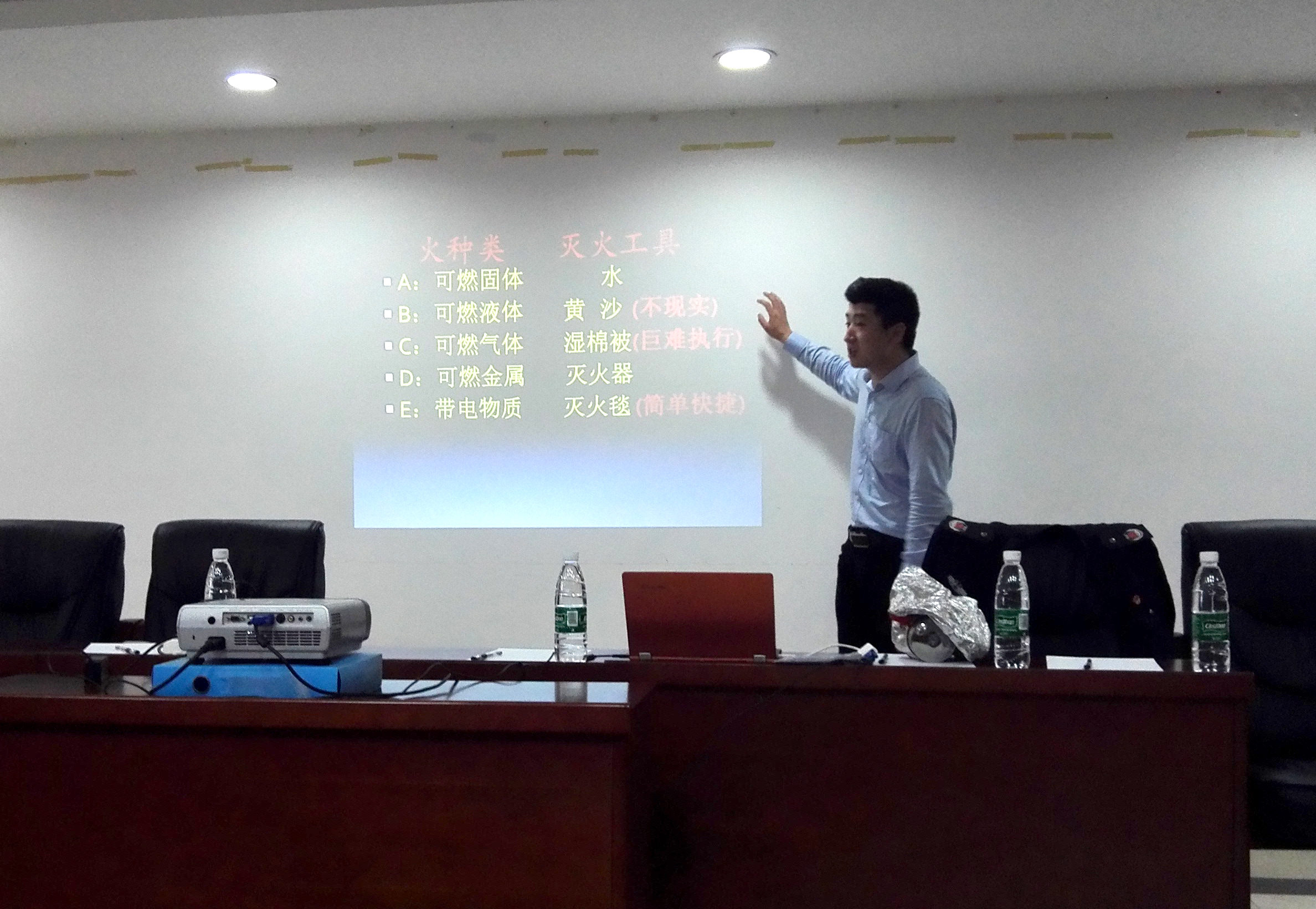 灭火器和灭火毯的使用方法:张教官给大家做了现场展示,即“一提二拔”;同时向大家推荐了家庭防火四件套:灭火器、绳子、防毒面具、手电筒;并建议大家使用家庭型防火工具。