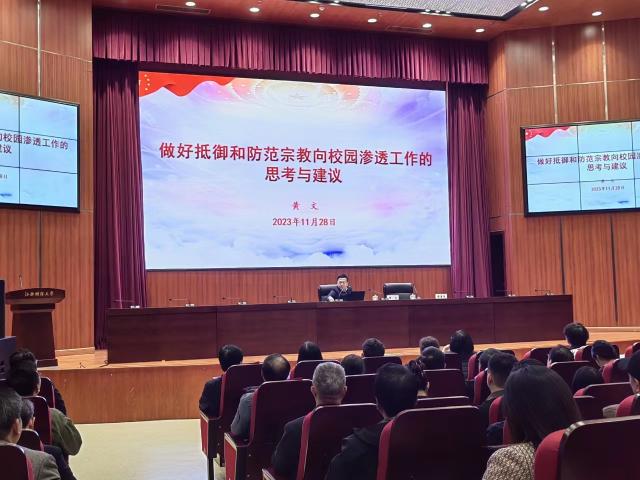 黄文结合工作实际,深入系统阐述新时代做好高校宗教工作的重大意义和有关要求,分析了当前宗教领域意识形态面临的形势和任务,通报了有关工作情况,并对高校抵御和防范渗透工作提出了切实可行的工作建议。讲座政治站位高、内容丰富、深入浅出、分析透彻,既有理论高度,又有实践深度,对进一步理解党的宗教政策法规、明确新时代学校宗教工作的目标任务和做好宗教工作的方式方法,指明了方向,提供了路径。