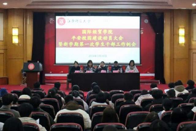 为确保开学前后各项工作平稳有序开展,筑牢校园安全防线,切实提高同学们的安全防患意识及安全防范能力。2月28日下午,国际经贸学院在国际学术报告厅召开平安校园建设动员大会暨新学期第一次学生干部工作例会。党委副书记马李琛,消防科科长喻冬冬,团委书记周妍,辅导员吴梦、熊瑛,以及全体班长支书、寝室长、心理委员参与会议。