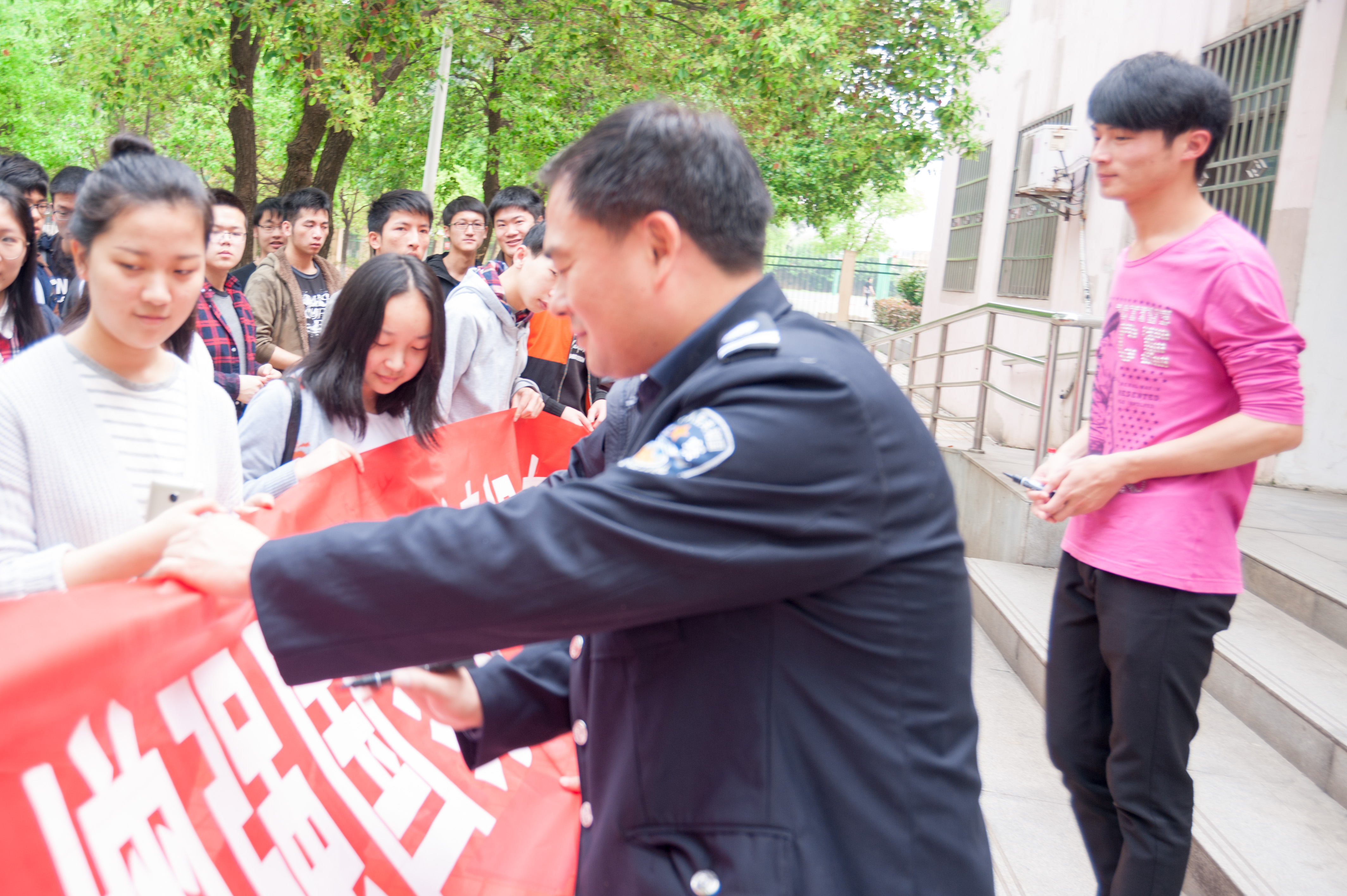 师生双方的观点不谋而合,激发了到场学生的热情,得到了学生的一致赞同与肯定。为表明对自身安全的重视、对国家安全的关注,学生在在场工作人员的疏导和指引下有序参与活动,在横幅上签下了自己的名字。不同的笔迹在横幅上陈列到一起,共同证明:大学生对国家安全并不是毫不在意,相反地,他们愿意、并积极的参与其中,希望能在维护祖国安全的大潮中贡献自己的力量。