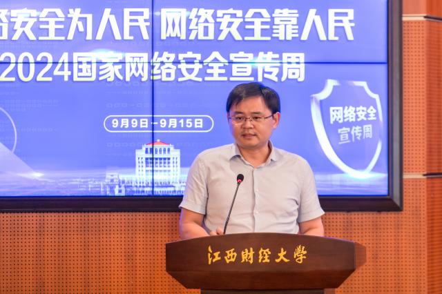 智慧校园管理中心主任黄茂军介绍了网络安全宣传周活动安排,学生代表洪盈盈宣读了 2024 年江西财经大学网络安全宣传周倡议书。