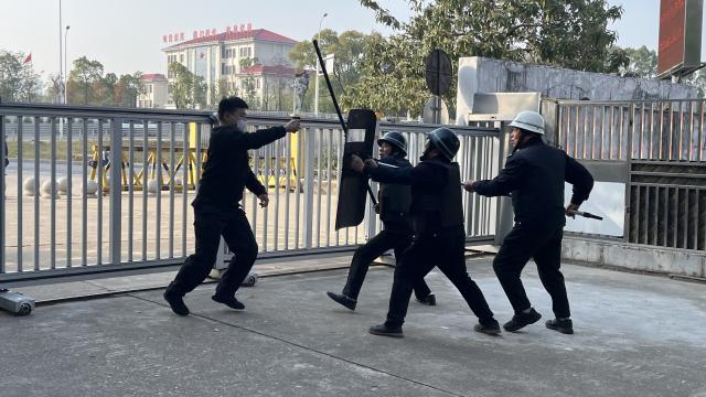大门发出急促的安全警报,保安立即上前阻止,并与之周旋。当天值班人员见状,以最快速度启动一键报警。由保安和值班人员组成的防暴小组迅速启动应急预案,组成一道安全防线。“歹徒”开始持刀肆意攻击,防暴小组手持钢叉、防爆盾、棍棒等器械,齐心协力将“歹徒”团团围住,摁压在地,最终成功制服“歹徒”。整个演练过程组织有序,配合默契,达到了演练的预期效果。