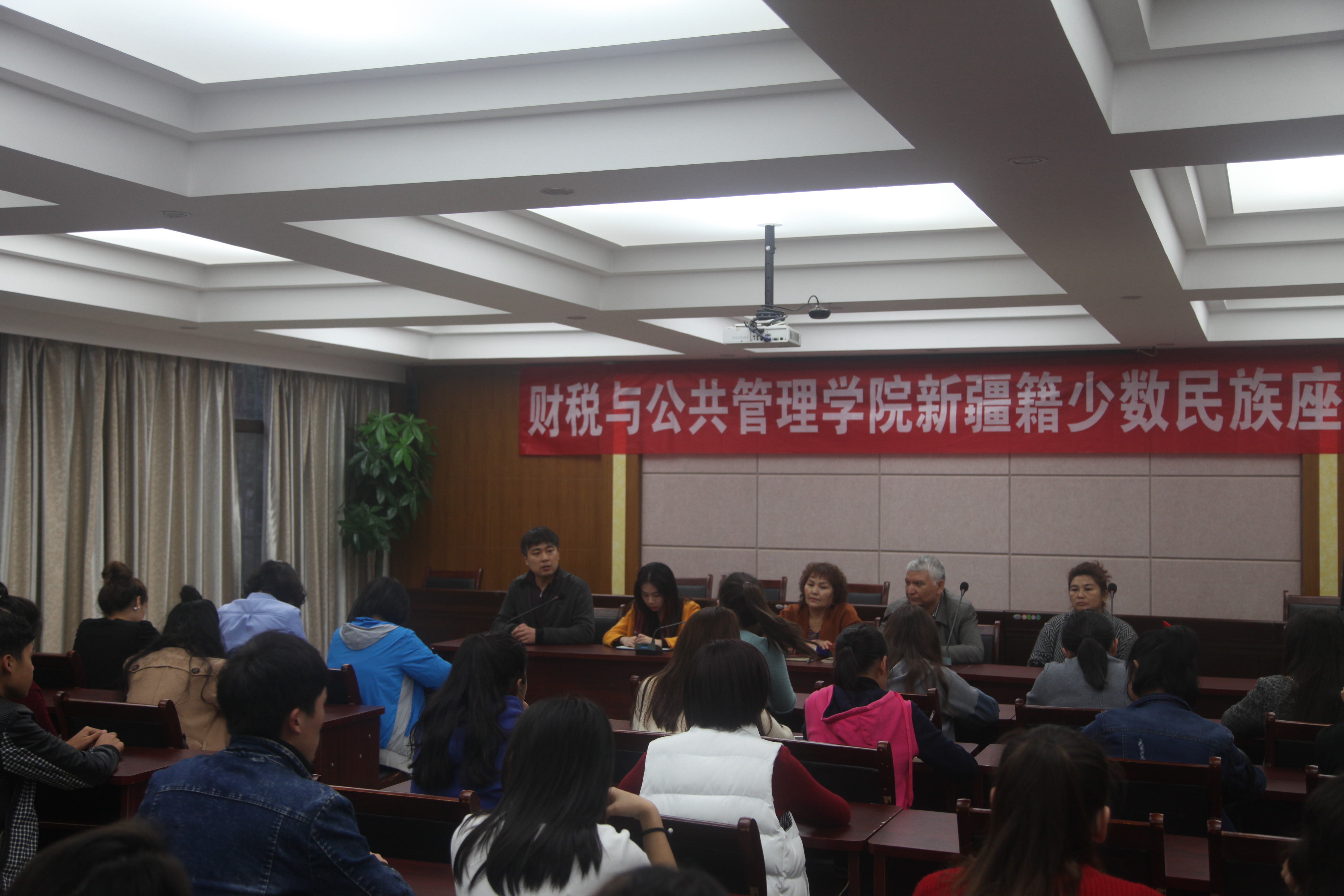 2016年11月17日下午17时,财税与公共管理学院学生会民联部于财税大楼二楼会议室,举办了新疆籍少数民族学生座谈会。此次座谈会意在通过畅所欲言,协商、沟通新疆籍学生在校遇到的相关问题、困难,更好地服务在校新疆籍少数民族学生,同时传播新疆文化,展现新疆人文风采。出席此次座谈会的有财税与公共管理学院分团委书记赵磊、辅导员邹梦沂以及三位新疆教育厅选派来校的老师。