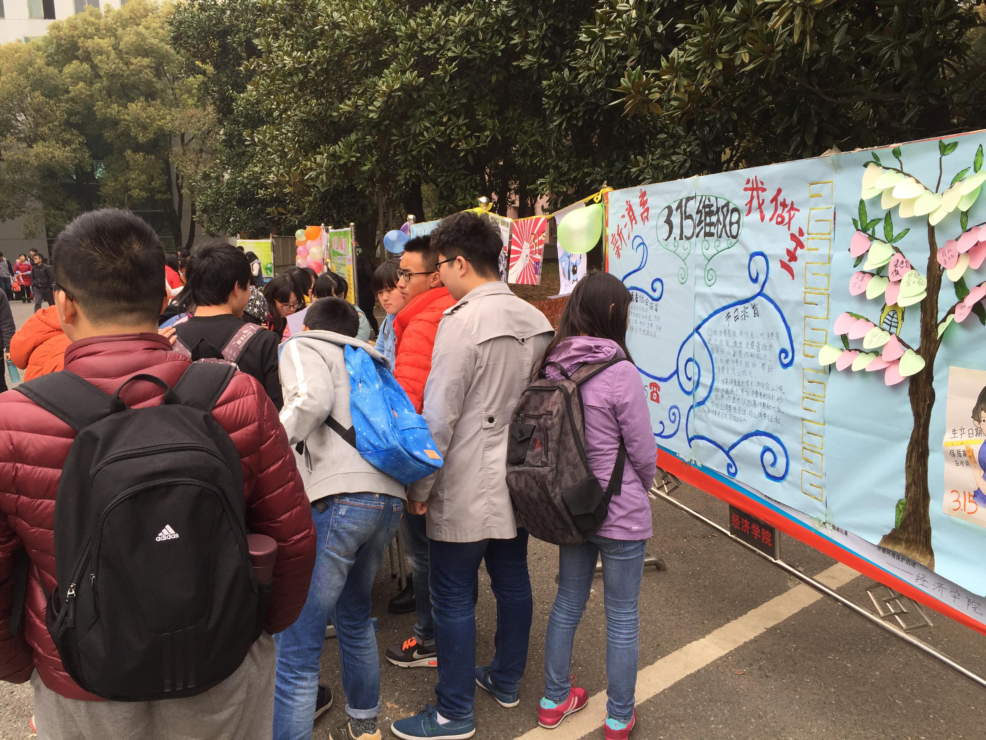 本次活动以“健康消费,理性维权”为主题,分为权益成果展示、权益知识竞答和“权”心服务体验三个模块。中午十二点,宣传点周围早已是人头攒动,水泄不通。这边,讲解员站在展板前通过系列生动的维权小漫画详细地为大家展示不断努力的成果,同时进行着有奖知识竞猜,引得同学们纷纷驻足观看。另一边,针对目前大学生们维权意识淡薄,维权途径匮乏的现状,维权部精心准备了心愿墙,引导广大同学勇敢地对侵权说“不”,并学会用正确的途径来维护自己的合法权利。一张张五颜六色的心形便利贴,写上的不仅仅是同学们遇到的侵权困境与维权看法,更反映了维权部真诚服务、认真维权的一片心。
