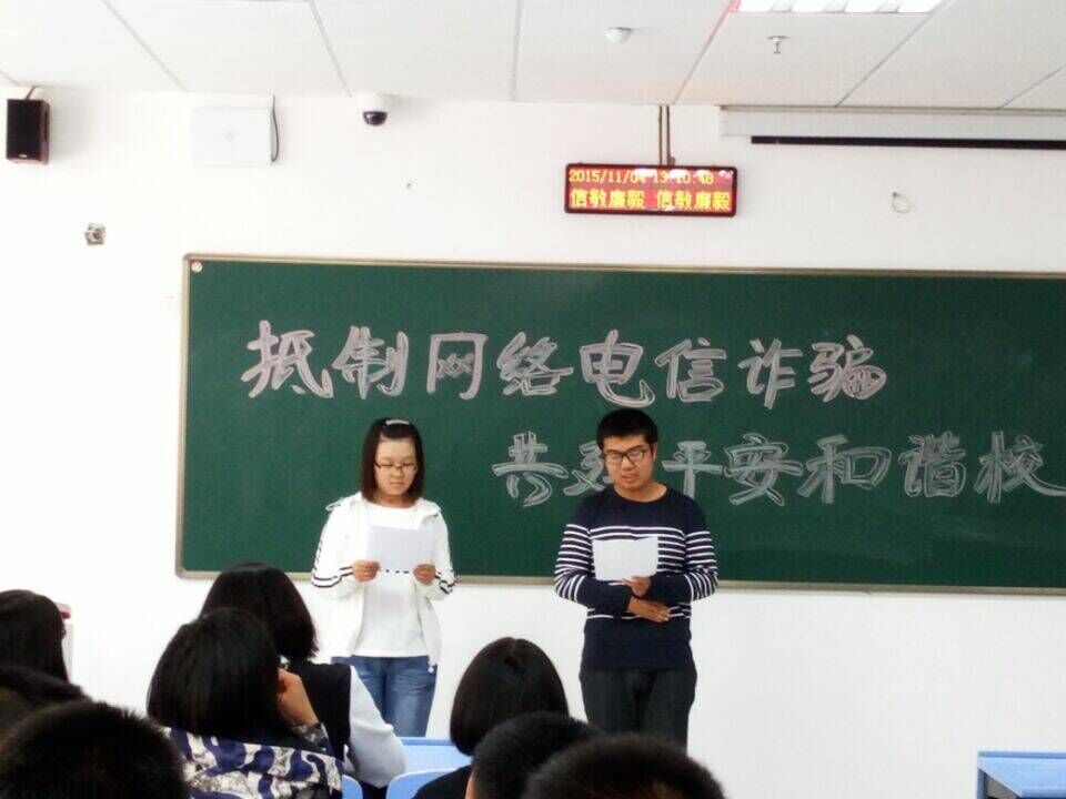 围绕这个主题,各班积极参与,以近期越来越多的电信诈骗案件为背景,以多样的表现形式展现着各班级对于本次班会主题的理解与分析,宣传了构建平安和谐校园的理念。其中,15工商管理1班的同学们以PPT案例展示和网络电信安全教育小视频相结合的形式,生动形象的向大家介绍了网络电信诈骗的危害以及防范方法,并且还以表演“网络电信诈骗案”情景剧的方式加深了大家对于网络电信诈骗的防范意识。其他各个班级也以自己独特的方式去提高大家的安全防范意识。
