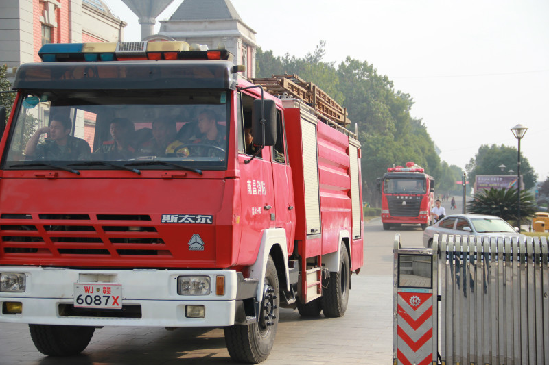 演习正式开始,突然在静庐A栋四楼出现“火情”,学生立即拨打119电话报警。信息管理学院党团老师和学生干部迅速赶到现场,组织学生模拟火灾现场逃离,学生们拿着湿毛巾或衣物沾水捂住口鼻依次有序进行疏散,逃离火灾现场。警报拉响,接到出警指令的昌北消防官兵开着消防车到达寝室楼下,消防武警采取延长水喉、消防车加压、从高楼索降到火场等手段进行火情控制,并迅速开展救援。同时南昌消防大队的官兵开着登高平台消防车到达现场,消防官兵娴熟地搭建云梯,安排消防人员爬向窗口营救被困人员。整个过程紧张而有条不紊地进行着,先“逃”下来的那些同学也站在一旁认真的观察着消防人员的营救过程并和身边的同学交流着一些火场逃生的小知识。