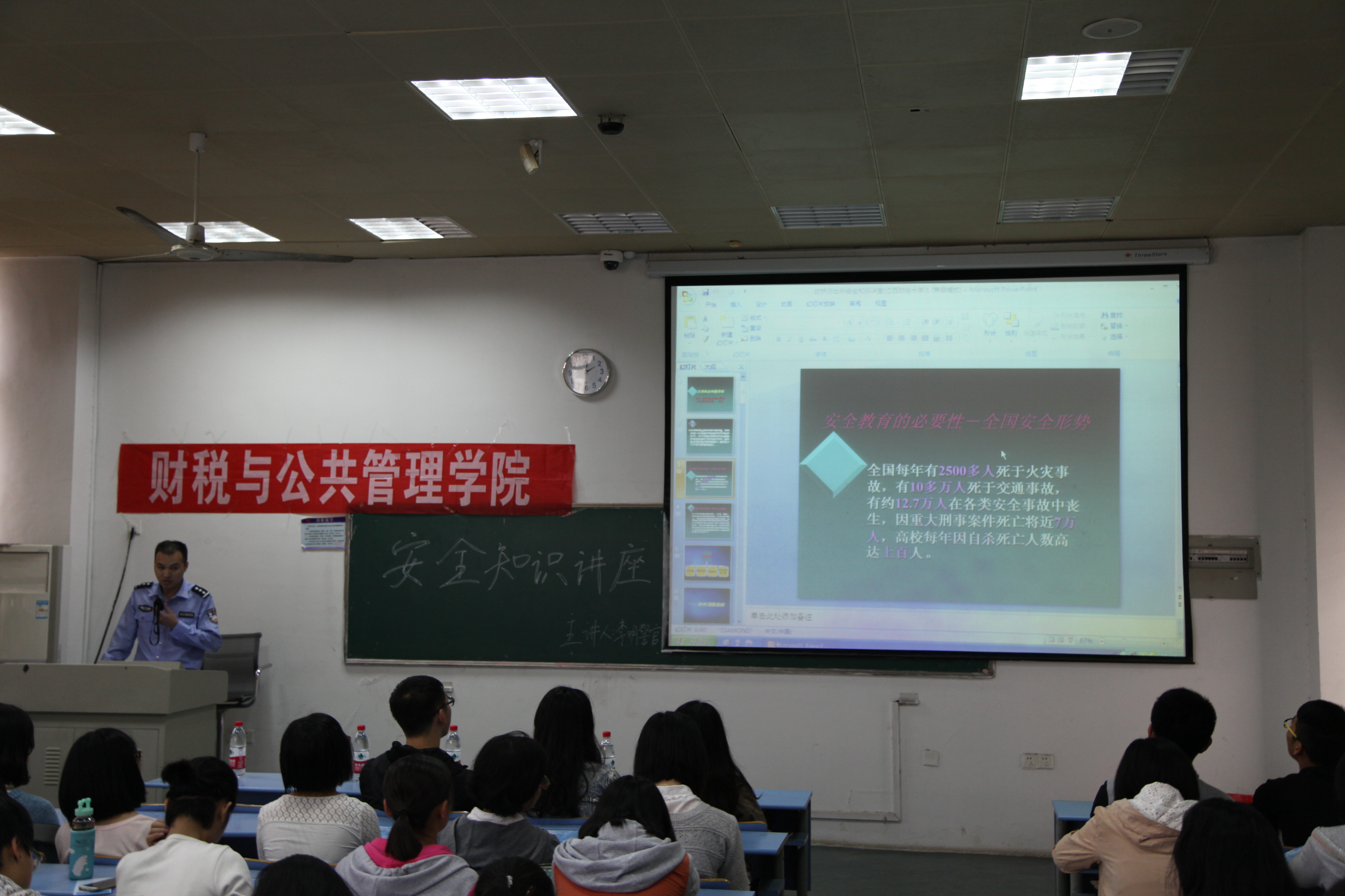 为全面加强学生的防范意识,我校财税与公共管理学院在2015年11月7日星期六下午2:00在蛟桥园南区举办了安全知识讲座。主讲人为蛟桥派出所警官李明。