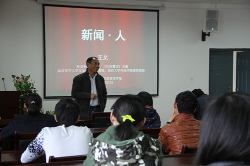 3月27日,应信息管理学院邀请,《新法制报》社编委、《江西警方》新闻周刊主编王文在荟庐402为同学们作了一个题为“新闻・人”的报告。此次讲座旨在帮助同学们培养新闻意识和新闻素养。报告会由信息管理学院党委书记姜红仁主持。院学生会宣传部、大骨班成员共70余名学生参加并聆听了此次报告会。