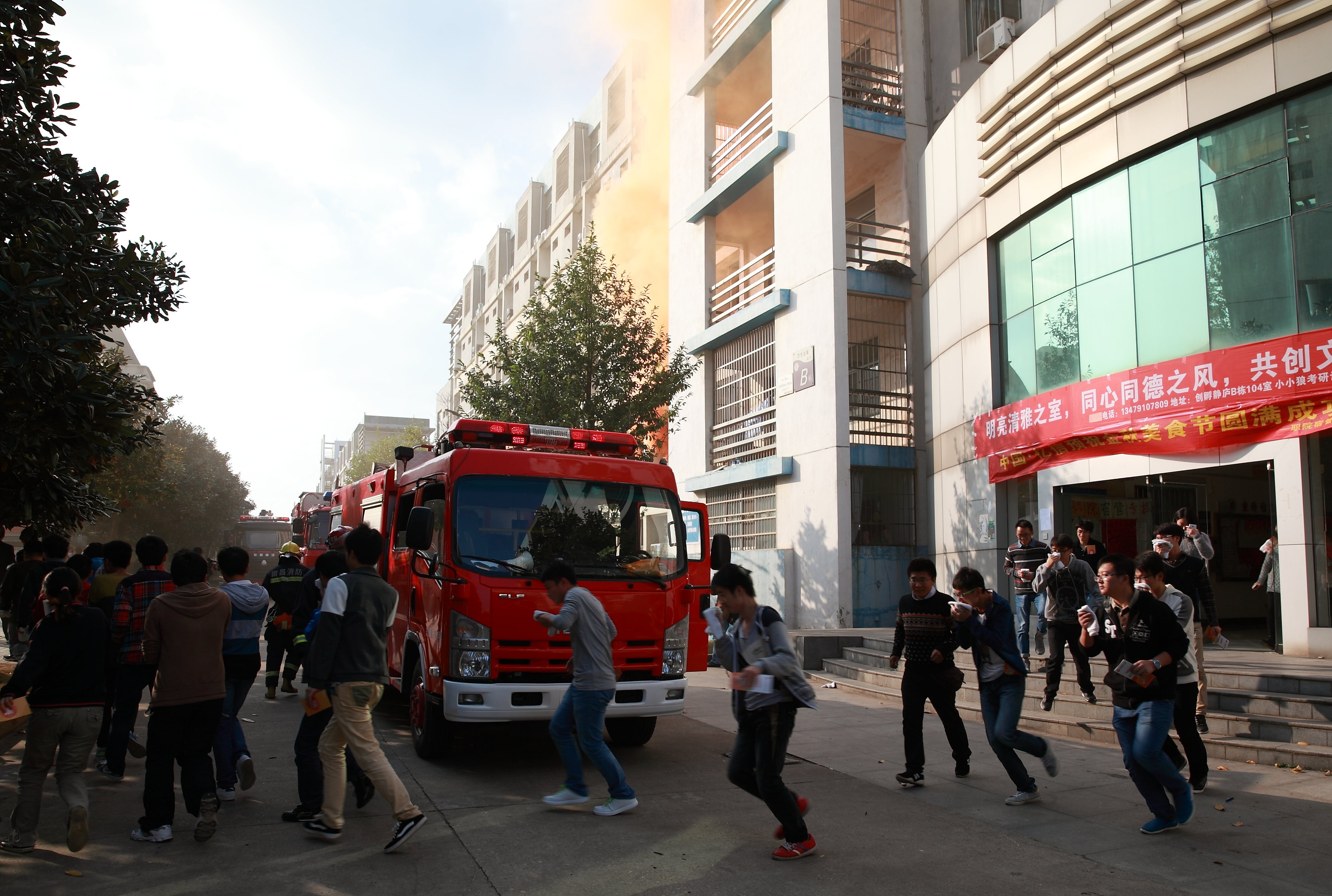 演习活动正式启动,全体参演人员各就各位,指挥员下达演习开始指令后,祥庐学生宿舍拉起发烟罐,一时间“浓烟四起”。接到报警后,消防大队、保卫处、校医院迅速赶到“火灾现场”开展疏散和救援行动。整个演习过程紧张而有序,一方面由消防大队官兵进行高压水枪灭火,架设云梯和充气垫进行救援,一方面由保卫处人员对宿舍学生进行有序疏散,校医院对“伤员”进行紧急救护。“火势”很快得到了控制,短短5分钟内,几百名学生安全撤离了火灾现场,“伤员”得到了有效救治,“被困人员”通过绳索、云梯和充气垫安全逃离了现场。整个演习快速高效,精彩纷呈,赢得了在场观摩师生的阵阵喝彩。