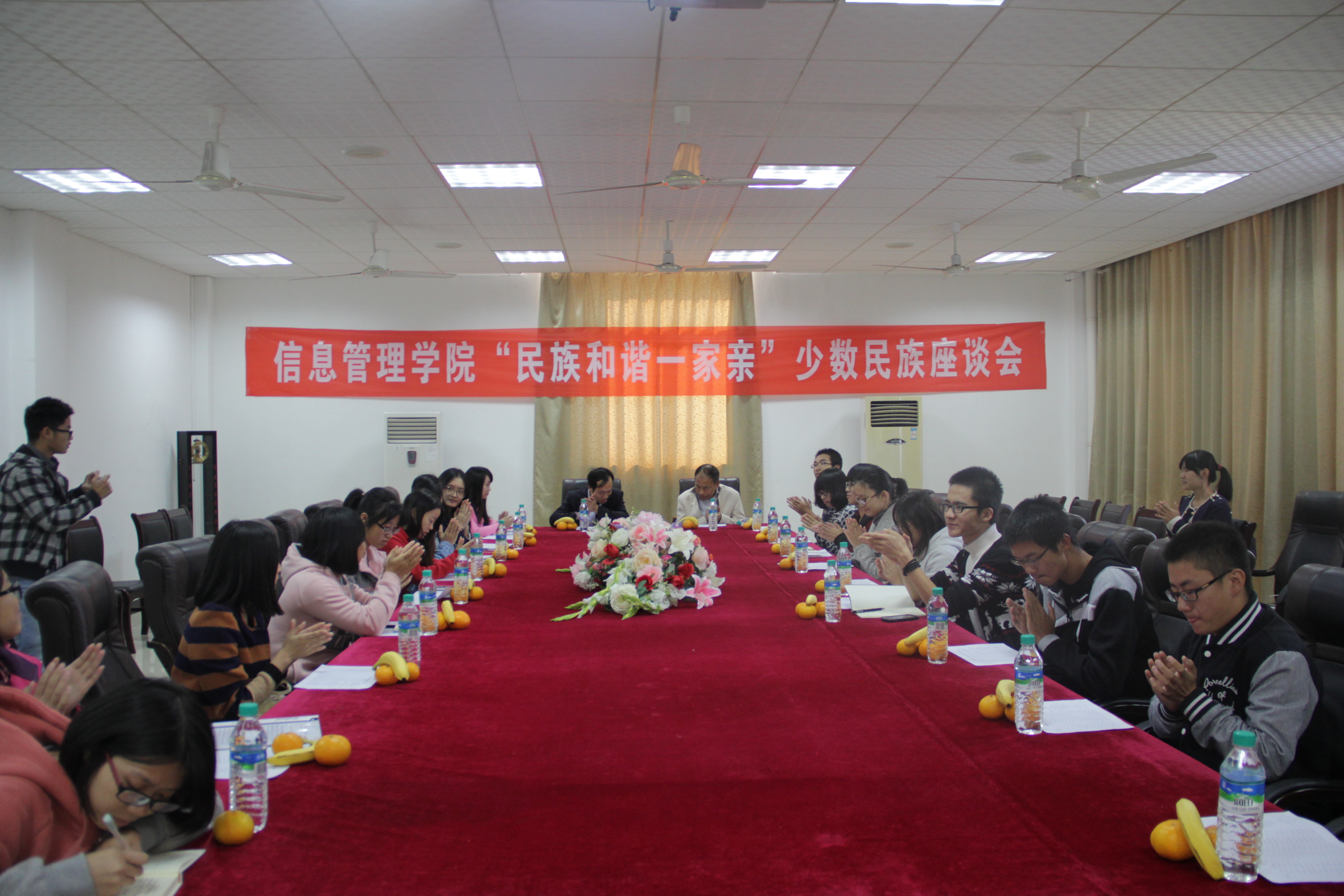 为深入了解少数民族学生在校期间的学习生活情况,营造和谐稳定的校园氛围,11月8日,由信息管理学院举办的“民族和谐一家亲”少数民族座谈会在荟庐顺利召开。16位来自苗族、回族、藏族、白族、壮族等不同民族的少数民族同学参加了座谈会。信息管理学院党委书记姜红仁,院党委副书记肖建文等党团老师出席了本次座谈会,并现场为少数民族同学答疑解惑。