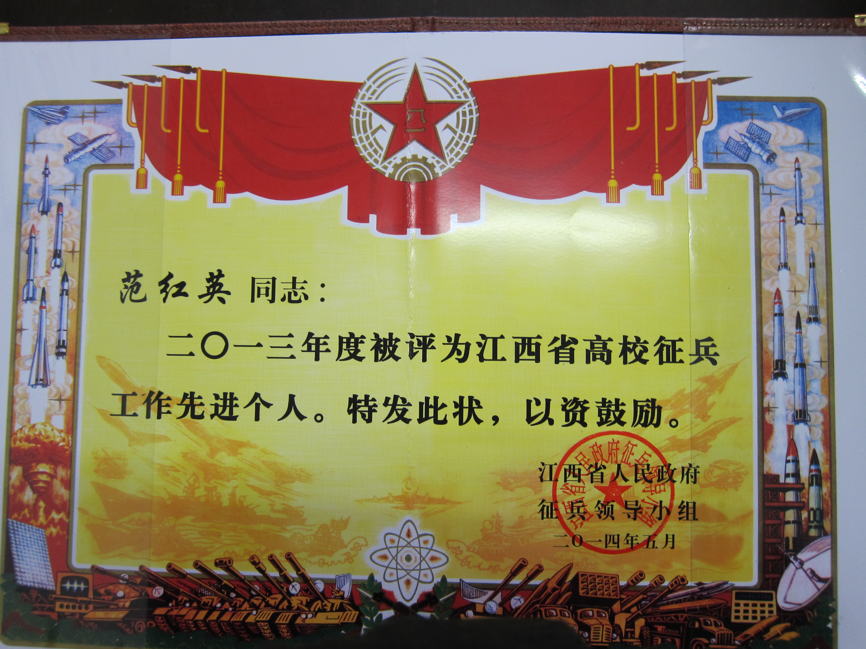 2013年,我校120名大学生报名参军,最终体检合格应征入伍23人,圆满完成了上级下达的工作指标。范红英同志在征兵工作中积极动员、多方宣传,认真协助和配合青山湖武装部来校开展的相关征兵工作,为部队征收高素质优秀人才作出了积极贡献。