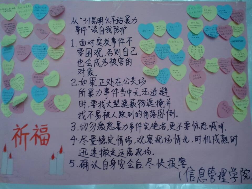 为了表达对昆明暴力事件中受害者的诚挚祝愿,普及暴乱事件自救知识,近日,由信息管理学院学生宣传部、心理健康协会、纪保部联合举办的"为昆明祈福"活动顺利开展。