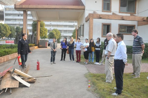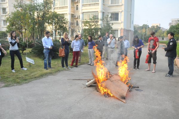 为了全力做好我校外教及留学生消防工作的贯彻宣传,进一步提高外教、留学生的消防意识以及应对火灾的快速反应和消防技能,2011年11月17日,国际合作与交流处特邀请校保卫处刘峰警官到外专楼组织了一场消防演习,对今年新入校的三十多名外教、留学生进行消防培训。 培训过程中,校保卫处刘峰警官向外教、留学生详细讲解了燃烧常识、火灾的形成、初期火灾的扑救、灭火器的使用、火场逃生及疏散火灾事故现场等有关消防常识。