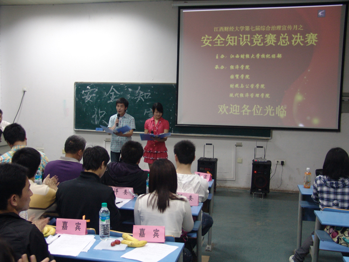由我校纪保部主办,经济学院、国贸学院、财税与公共学院、现代经济管理学院承办的“第七届安全知识竞赛总决赛”于4月23日晚上6点半在蛟桥园南校区1101教室成功举办。
