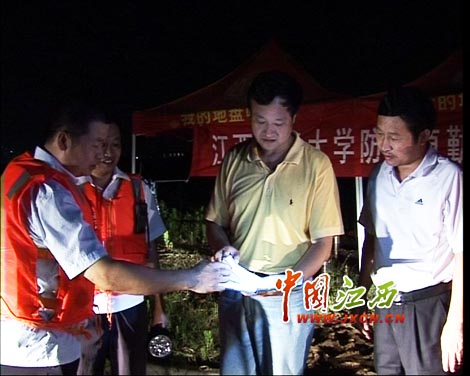 6月26日晚江西财经大学校领导带领学校相关负责同志到责任堤慰问了战斗在抗洪一线的教职员工,现场察看了汛情和防汛准备情况。要求值班人员以高度的责任心认真负责的做好巡查工作,对责任堤易出现险情的要害部位进行重点巡查,对可能发生滑坡地段进行严密监控,在巡查中发现的隐患和问题及时报告。齐心协力做好防汛抗洪工作。
