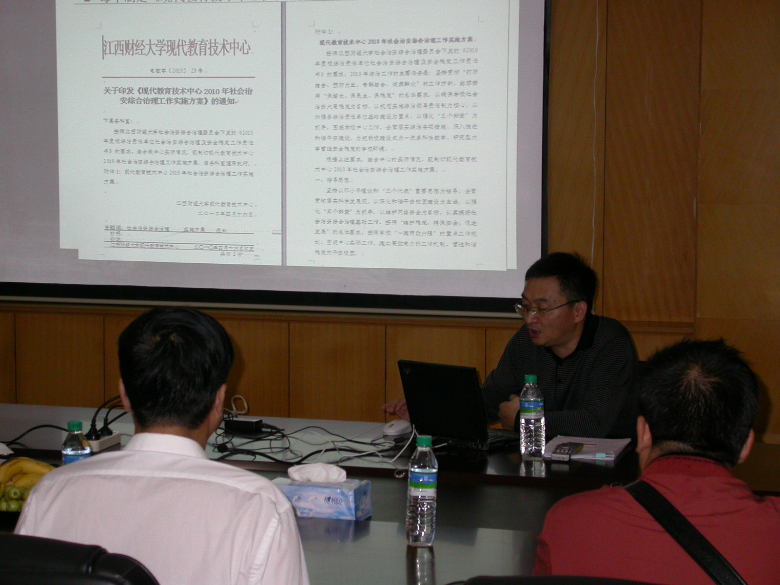 2010年 9月26日下午,江西省教育厅安全稳定工作检查组的领导同志一行人来我校进行安全稳定工作评估。在副校长肖华茵及校保卫处同志们的陪同下来到了现代教育技术中心进行安全稳定工作检查,中心主任陆旭同志就中心2010年安全维稳工作开展的情况做了专题汇报,总支书记罗明芳同志和副主任肖清雷同志也参加了会议。
