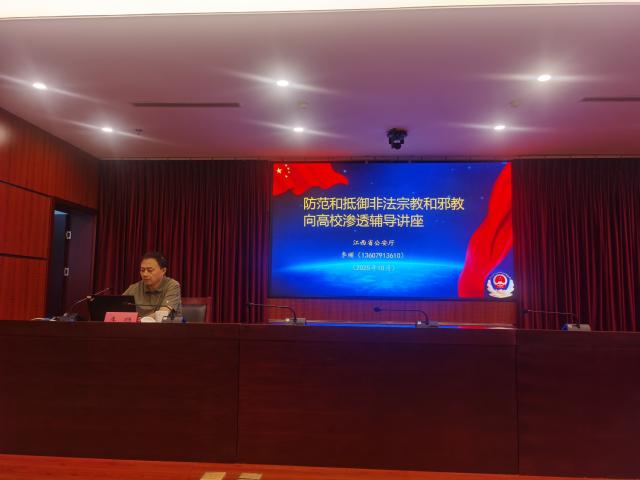 为切实筑牢高校意识形态安全屏障,有效防范和抵制非法宗教与邪教向校园渗透,统战部特邀省公安厅李顺同志,开展防范和抵御非法宗教和邪教向高校渗透专题辅导讲座。