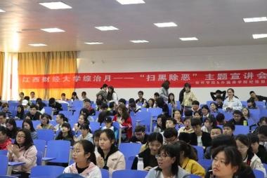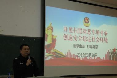本次活动强调"治根治本",扫黑除恶。徐科长在宣讲中强调了扫黑除恶的重要意义是为社会大局稳定和国家长治久安,保证国家政权的稳固。用校园案例以及身边实例向同学强调远离黑恶,防止误入歧途。并且通过播放视频讲解的方式使学生更加感同身受。徐科长深入分析学生心理薄弱点,呼吁学生强大内心,不受诱惑,不追求不切实际、不劳而获的"美梦",应通过自身努力实现美好生活。