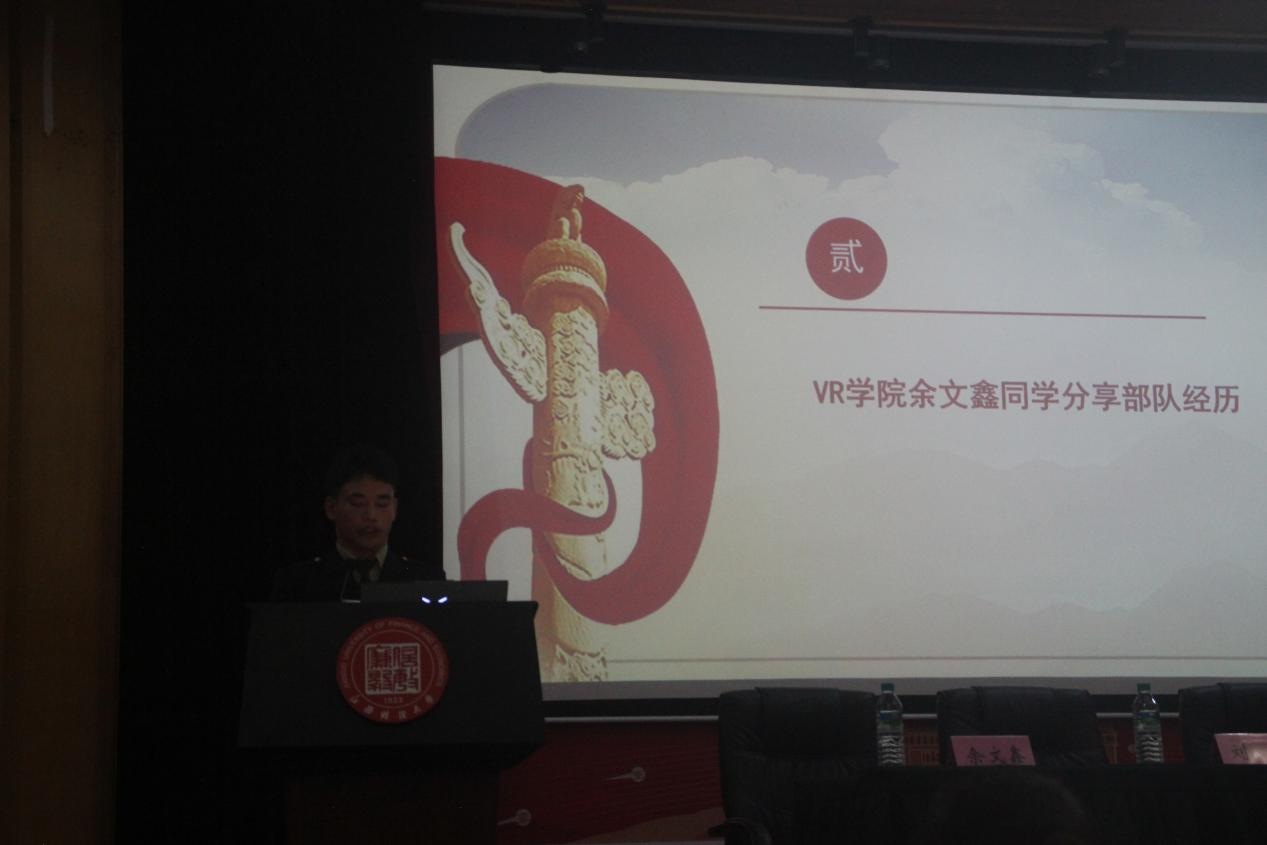 虚拟现实(VR)现代产业学院余文鑫同学既是一名退役士兵大学生,也是一名造血干细胞捐献者。他分享了自己二年的军旅生涯及退役后的青春奋斗篇章,希望个人的经历和故事能够激励更多的同学积极参军入伍,为国家和人民的安全和发展贡献自己的力量。